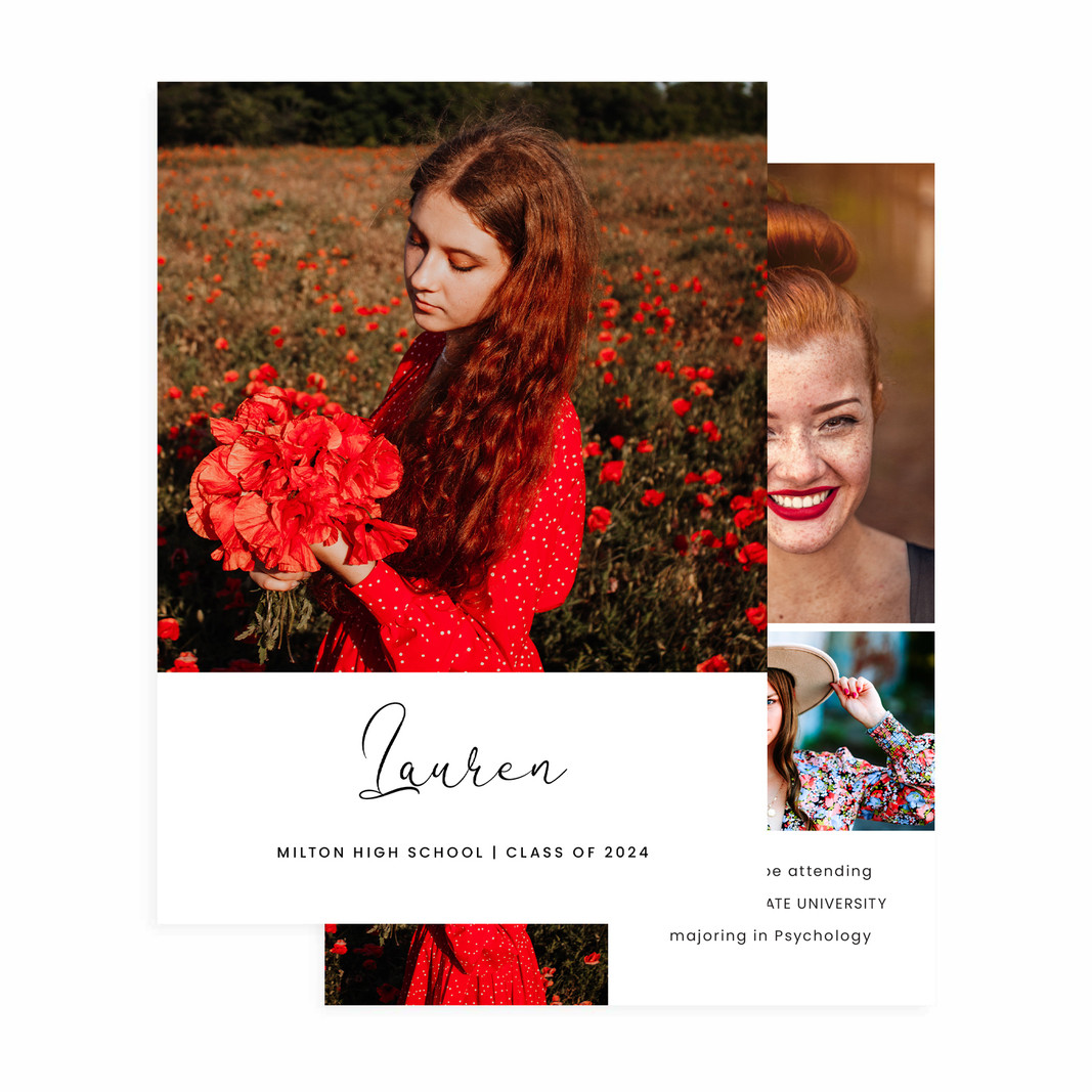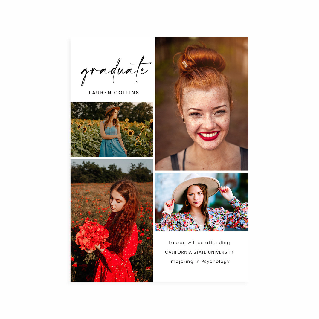 Create a custom graduation card featuring your favorite photo and message that showcases your personality and style. Make it a unique and memorable way to share your achievements. Simply upload your photos or senior portraits, drag them into the template and customize your name and event details. If you would rather make your own completely custom card, look for our DIY option.
