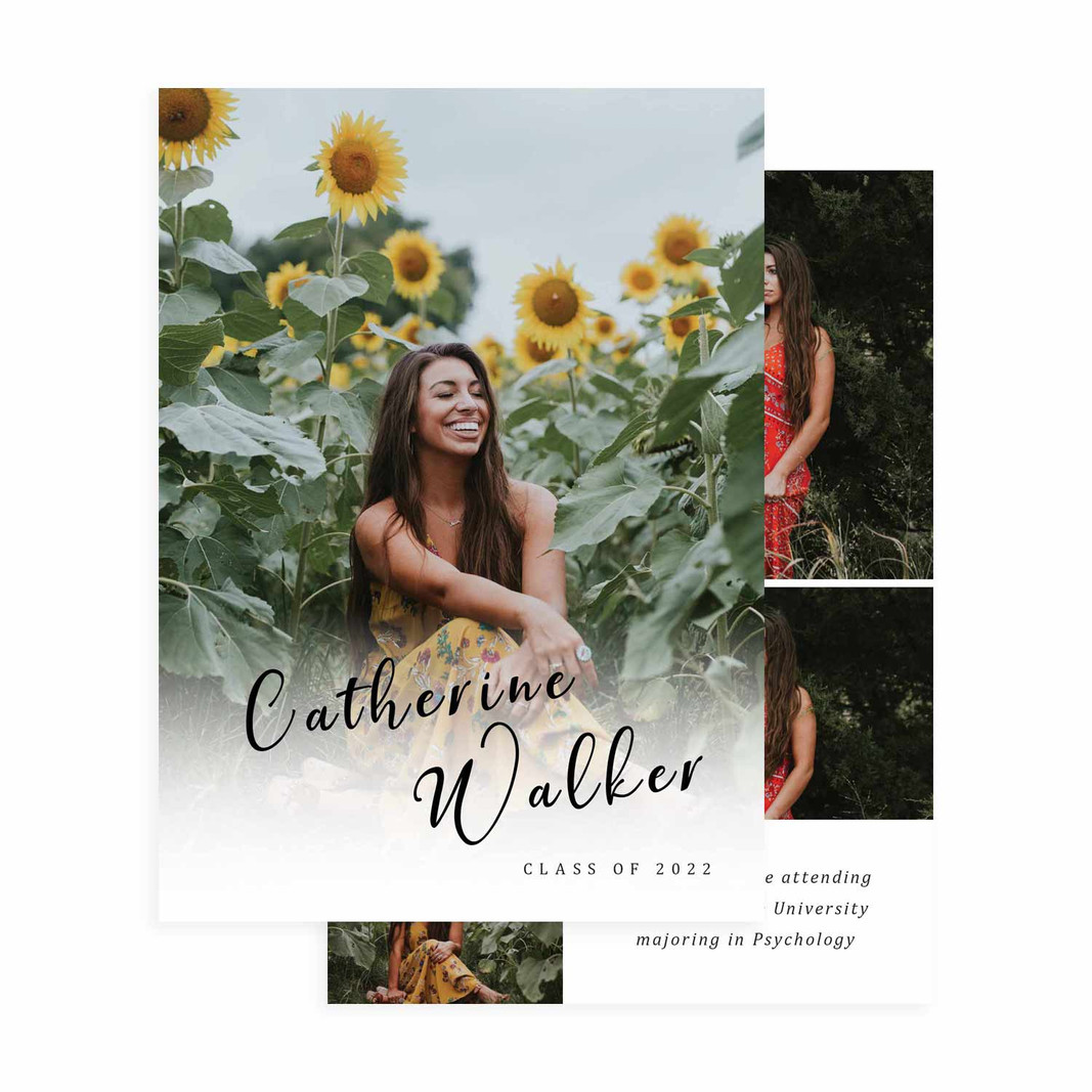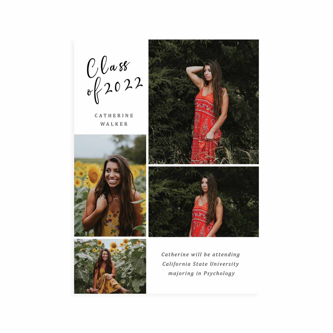 Create a custom graduation card featuring your favorite photo and message that showcases your personality and style. Make it a unique and memorable way to share your achievements. Simply upload your photos or senior portraits, drag them into the template and customize your name and event details. If you would rather make your own completely custom card, look for our DIY option.