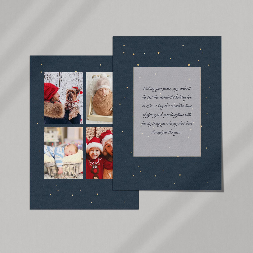 Send an extra sparkle of warm wishes to family and friends! Metallic cards are printed using real metallic inks. Choose from gold or silver and add your favorite holiday photo. Add more photos to the back or choose the letter-back layout and write your own personalized note.